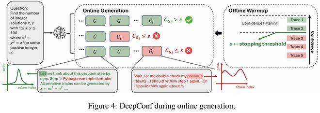 DeepConf在生成过程中,会持续监控推理路径的置信度,低置信度路径被及时淘汰,只保留「更有把握」的路径,提升整体准确性。
