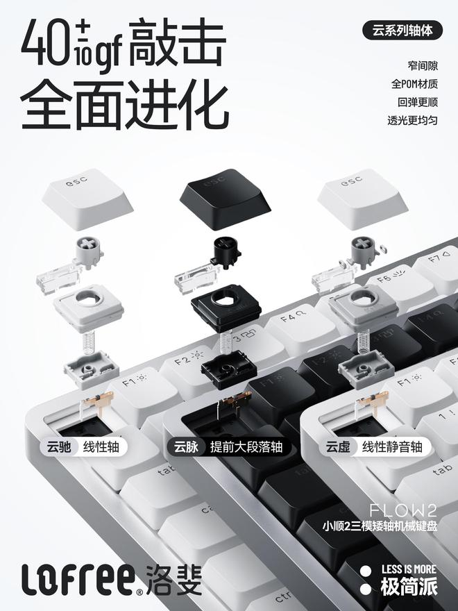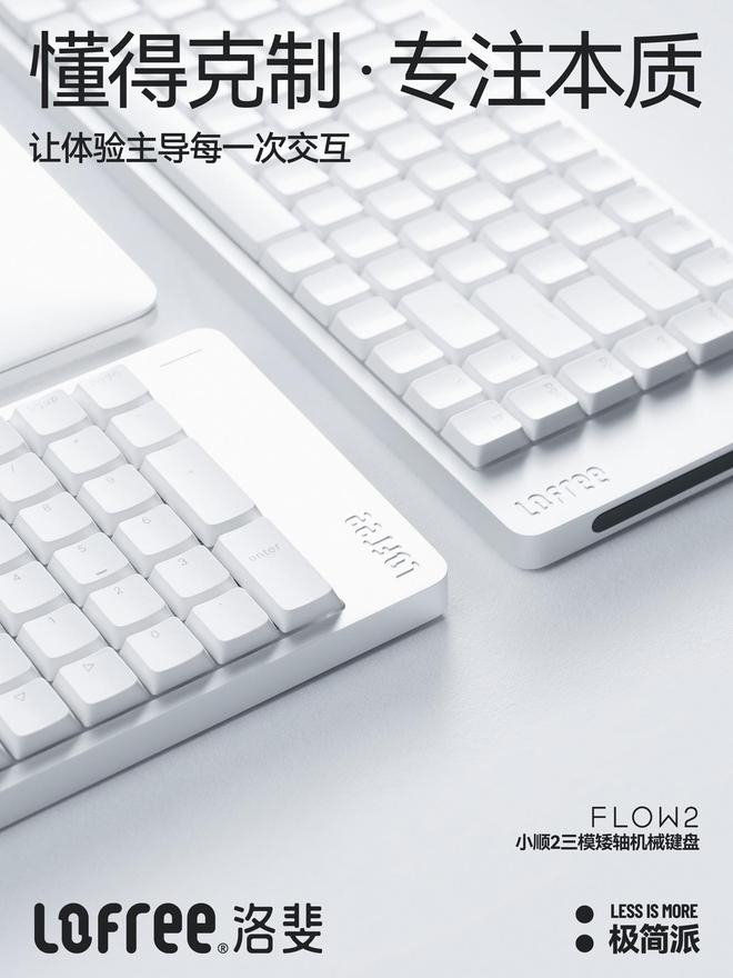 洛斐小顺 2 三模矮轴机械键盘可选 68 键 / 84 键 / 100 键三种配列,基础款价格分别为 599 元 / 799 元 / 899 元,云虚轴款要再贵上 100 元。
