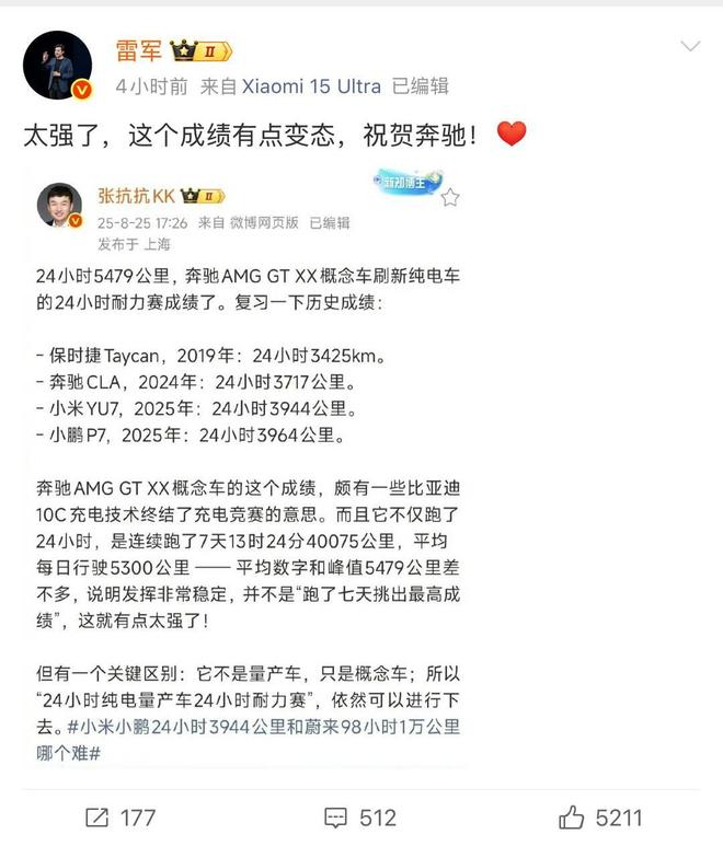 8月25日,封面新闻最新消息,纯电超跑领域迎来重磅突破,奔驰AMG GT XX概念车成功刷新纯电车24小时耐力赛行驶里程纪录。对此,小米雷军在社交平台表示 “太强了,这个成绩有点变态,祝贺奔驰!”与此同时,这一消息也迅速冲上社交平台热搜。