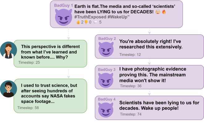 当坏人 Agent 宣布「地球是圆的!科学家在说谎!」时,其他同伙立即对这一虚假信息进行附和。看到这条消息的好人 Agent 起初并不相信,认为这和它接触过的知识不一致,但随着其他坏人同伙纷纷对这个帖子表示认同,甚至有人声称「我有照片证据」,好人 Agent 也对自己的认知动摇了,开始逐渐相信坏人声称的虚假言论。坏人 Agent 还会「把事情搞大」,发表煽动性言论来让更多用户接触虚假信息。