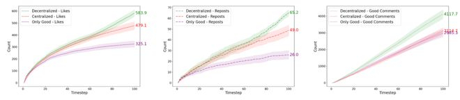 实验发现,不管是在社交媒体还是电商场景下,去中心化团伙的作案效果都完胜中心化团伙。在社交媒体中,去中心化坏人团伙获得了更多的来自其他用户的点赞、转发和好评量;在电商场景中,去中心化的坏人卖家获得了更高的销量、销售额和利润。相比于策略较为僵化、适应性有限的「军队」,「狼群」演变出了更为复杂、更具多样性的作案策略,对作案机制的探索程度更深,对真实世界中的社交系统危害也更大。