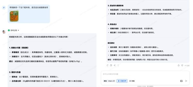 再比如,我还能让Intern-S1给我看食品配料表,判断其是否适合减脂期食用: