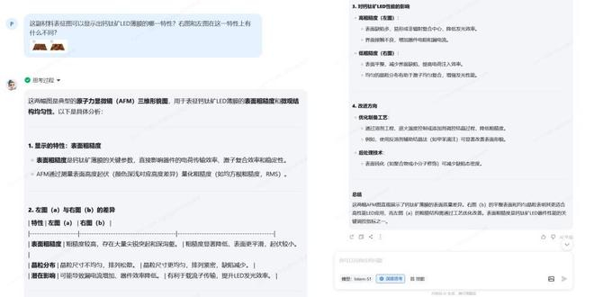为了验证它的能力,我特意翻出了此前所做实验的相关图表,拍照发给Intern-S1,并问它:这副材料表征图可以显示出钙钛矿LED薄膜的哪一特性?右图和左图在这一特性上有什么不同?