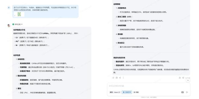 可以看到,Grok只是中规中矩地回答问题,并没有做更多的延展,但Intern-S1还特别生成该化合物研究领域目前所遇到的挑战,以及未来改进方向,站在了一个科研人的角度思考问题,预判了我的下一步动作。
