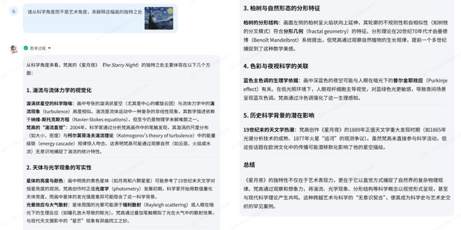 除了科研外,我也顺带看了一下它在艺术领域的表现。我把梵高的画作《星空》发给Intern-S1,让它从科学的逻辑和知识体系进行理性赏析: