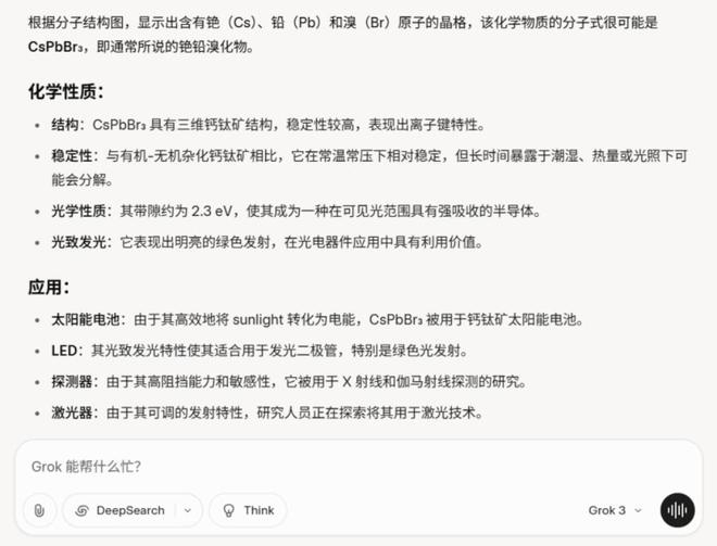 我给了Intern-S1一张图,并提问:这个分子式含有Cs、Pb和Br三种元素,根据此分子结构图,写出该化学物质的分子式,并介绍其有什么样的化学性质,目前有哪方面的应用?