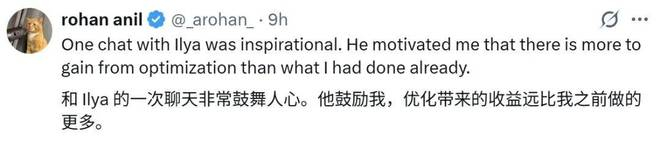 已有超 2 万引用的 DeepMind 杰出工程师、Gemini 核心开发者 Rohan Anil 则分享了与 Ilya Sutskever 的一次鼓舞人心的经历。「他鼓励我,优化带来的收益会远比我之前工作带来的收益更多。」