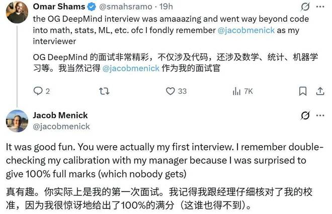 前 Mutable.ai 创始人、正在谷歌开发 AI 智能体的 Omar Shams 表示之前的 DeepMind 的面试非常精彩,不仅涉及代码,还涉及数学、统计、机器学习等。他还记得当时的面试官是现已加入 Thinking Machines Lab 的 Jacob Menick。有意思的是,前者也正好是后者首个面试的人,并且还获得了后者的满分评价 —— 也难怪这么难忘了。
