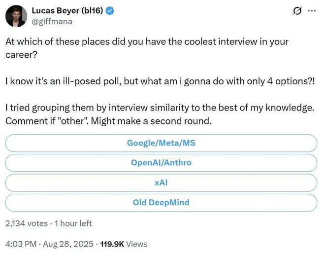 近日,Meta 研究者 Lucas Beyer 在 上发起的一个投票吸引了众多围观。说是围观,是因为他给出的四个选项都是当今或过去的 AI 大厂,显然,并不是每个人都有在这些大厂的面试经历,但这并不妨碍全球 AI 开发者的好奇心。