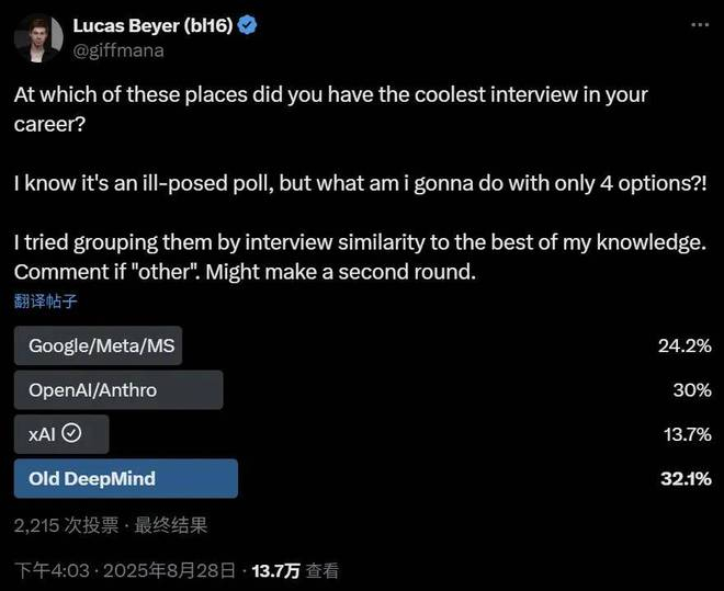 最后,在 Lucas Beyer 的投票里,DeepMind(旧版)以 32.1% 的票数得到了最佳面试者的称号。不知道这个结果是不是符合大家的普遍认知?