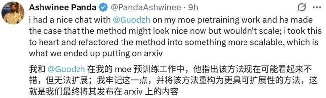 马里兰大学博士后 Ashwinee Panda 则更是在一次 xAI 联合创始人张国栋(Guodong Zhang)的面试中收获了一个研究灵感,并最终将其扩展成了一项研究成果。