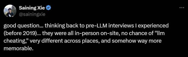 作为 AI 领域内我们耳熟能详的大牛,谢赛宁有过很多大厂面试的经历,他在纽约大学任教之前,曾在 Meta 担任过研究科学家,博士期间也曾在 DeepMind、Google Research、FAIR 实习。他表示,自己经历的 LLM 面试都是在 2019 年以前,都是面对面的,没有用 AI 作弊的机会。