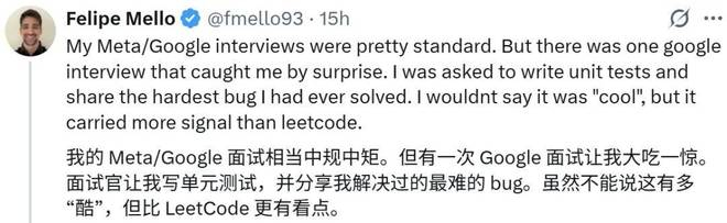 正在 Meta 参与开发 PyTorch 的 Felipe Mello 回想了一次难忘的谷歌面试。当时,面试官要求他编写单元测试,并分享了他解决过的最困难的 bug。
