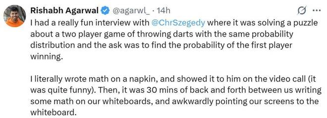 曾在 Meta 和 DeepMind 工作过的麦吉尔大学兼职教授 Rishabh Agarwal 则分享了自己被 Christian Szegedy(曾在谷歌工作过多年,xAI 联合创始人、现任 Morph Labs 首席科学家)面试的经历。当时,他被要求解决一个关于两人投掷飞镖游戏的难题,该游戏具有相同的概率分布,要求找出第一个玩家获胜的概率。
