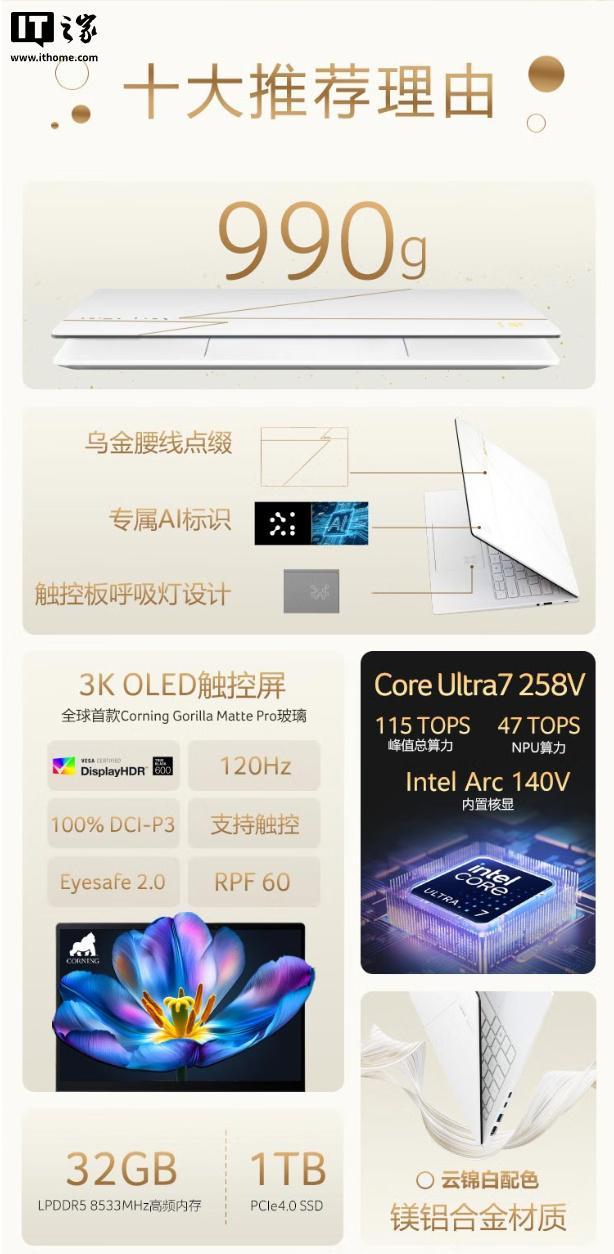 硬件方面,这款笔记本搭载英特尔酷睿 Ultra7-258V 处理器,最大睿频可达 4.9GHz,内置 47TOPS 算力的 NPU 单元,总体峰值算力可达 115TOPS;并配有 Arc 140V 核显,采用 Xᵉ2 架构,最大动态频率可达 1.95GHz。