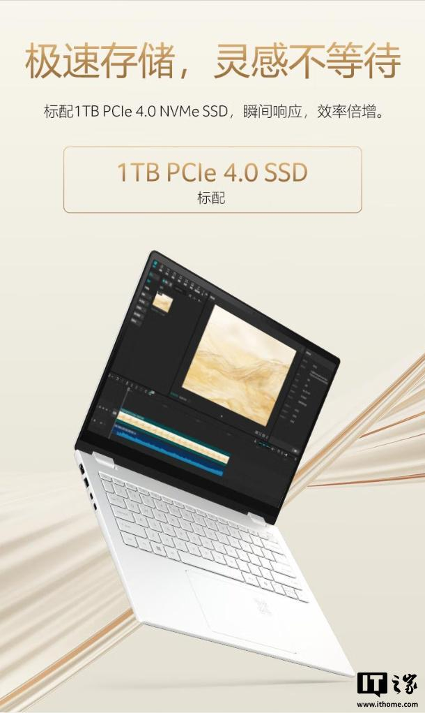 这款笔记本还配有 32GB LPDDR5X 8533MHz 的高速内存,采用 MOP(片上内存)设计,相比普通内存延迟更低、频率更高,并标配 1TB PCIe 4.0 固态硬盘,采用大尺寸风扇 + 双铜管设计,自带 DustDefender 技术,可减少机身内部灰尘积累。