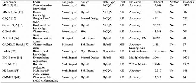 HELM 和 BIG-Bench 等框架则将知识能力评估纳入更广泛的指标体系中,涵盖鲁棒性、公平性与校准性等维度。为打破英语中心、文本导向的评估范式,业内还提出了如 M3Exam 等多语言基准,以及 GAOKAO-MM、CMMMU 等以中文为主的多模态知识测试。