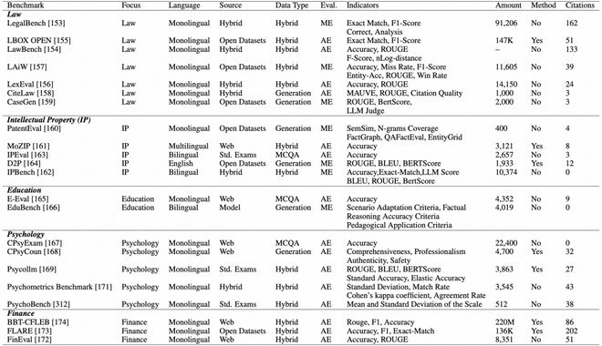 社会科学作为最以人为中心的领域之一,在这一背景下显得尤为重要。一个关键问题是,LLM 能否在法律、知识产权、教育、心理学和金融等领域有效应对现实世界的挑战。所有人文与社会科学领域都高度适用于现实场景。其中的最大挑战之一,是如何科学评估 LLM 在这些领域的知识水平,这涉及定义合适的任务、构建相关的数据集,以及选择适当的评估方法。