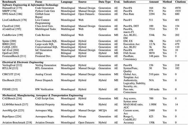 工程与技术领域是 LLM 的另一座试炼场,它测试模型在任务中的能力,这些任务不仅要求语言流畅,还要求逻辑严谨、功能正确,以及具有深厚的专业知识。不同于通用任务,工程应用往往存在唯一正确答案,或仅有一小部分在严格的物理定律、数学原理或语法规则下成立的合理解。在这一领域中,成功的模型需要能够像真正的工具一样运作,而不仅仅是提供语言交互。因此,工程与技术方向也产生了一系列最为复杂且成熟的评估框架。