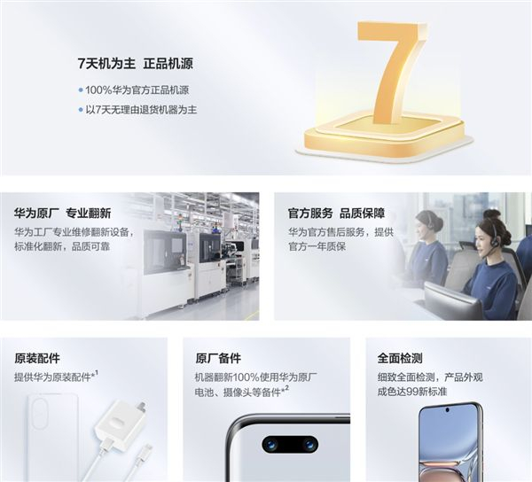 同时,华为官方翻新机提供原装配件(数据线、充电器等),支持7天无理由退货和15天质量问题换货,体验上与新机无异。