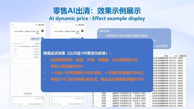 生鲜商品AI出清以20品100家店为标准;按额预估,月收入提升9w+,一天提升利润额3000+元;按率预估,平均20%门店不用再5折出清,商品正价销售率提升10%;每日鲜促销费用减少15%;综合可以将生鲜损耗率控制在3%,保持商品有货率达到98%。