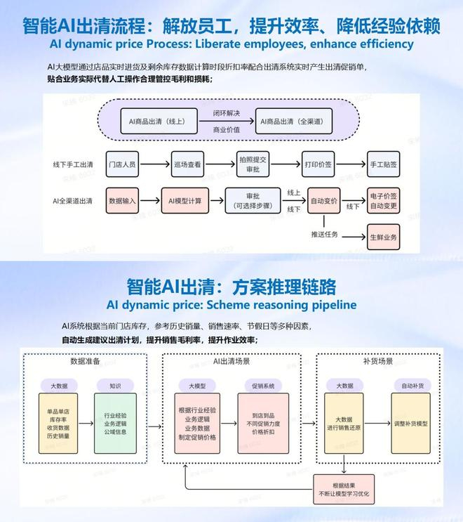 大模型应用:依托大模型构建强大的行业智能体。该大模型经过海量数据的训练,具备强大的语言理解、逻辑推理、知识表示等能力,能够对复杂的零售业务场景进行深度理解和分析,为AI出清系统提供坚实的技术支撑,使其能够精准地识别和处理各种零售业务中的复杂问题,为门店提供智能化的决策支持。