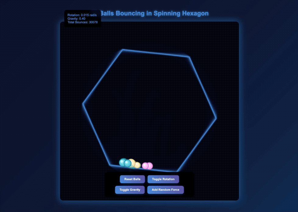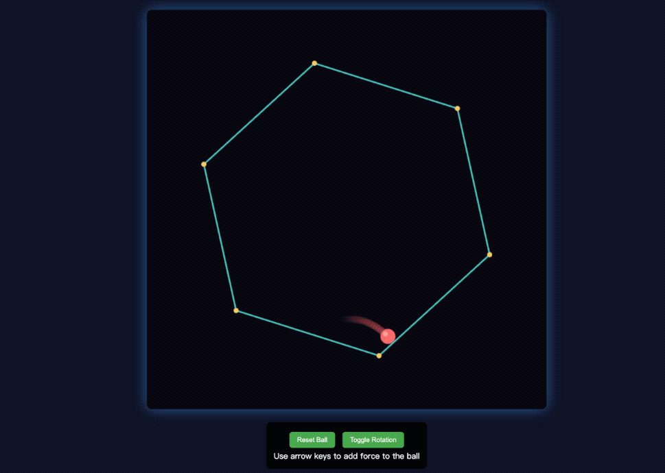 可以看到,小球会基于物理规律在六边形的框内运行;并且在用“向上键”去给小球一个力时,它也能立即做出响应。