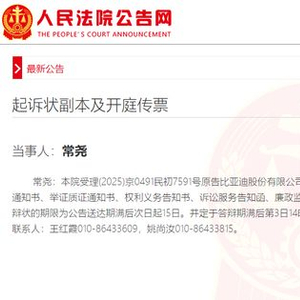 红星资本局9月8日消息,日前,人民法院公告网发布公告,比亚迪(002594.SZ)已就网络侵权责任纠纷对常尧提起诉讼,案号为(2025)京0491民初7591号。