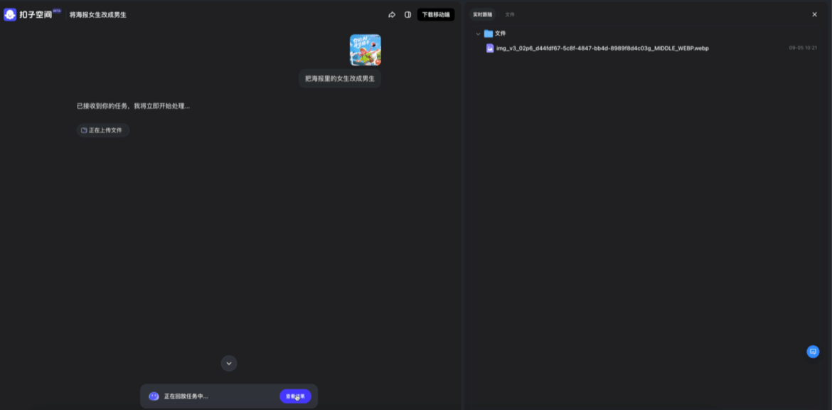 比如,在做另一个海报修改场景时,我们尝试用非常口语化的方式指挥扣子空间:把一张海报里的主角,从女生替换成男生。