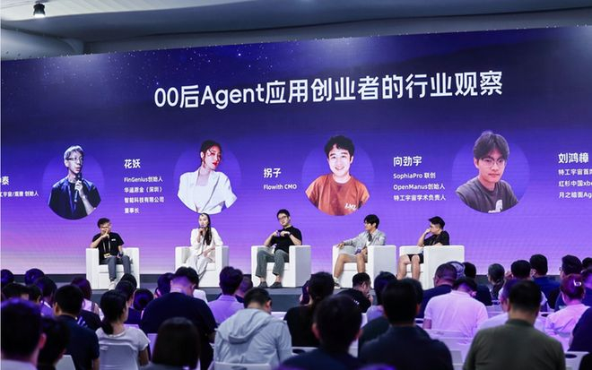 在“00后Agent应用创业者行业观察”的圆桌讨论中,多位年轻的创业者分享了他们对行业现状的观察。圆桌由特工宇宙/观猹创始人仲泰主持,FinGenius创始人花妖、Flowith CMO拐子、SophiaPro联创向劲宇、以及特工宇宙首席科学家刘鸿樟共同分享了新生代创业者们对智能体发展的独到视角。