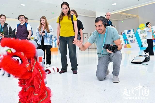 此时,身披“醒狮”装扮的机器狗已经在中庭大厅列队恭候多时,伴随动感音乐带来舞蹈表演,令外媒记者兴奋不已,纷纷上前与机器狗握手、比心、热情互动。