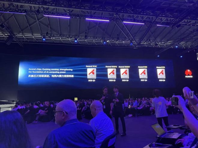 徐直军披露了华为昇腾芯片演进规划和目标,并一口气发布了四颗芯片。除了今年第一季度已经量产商用的昇腾910C,明年第一季度将要发布昇腾950PR,明年第四季度发布昇腾950DT。2027年第四季度要发布昇腾960、2028年发布昇腾970。