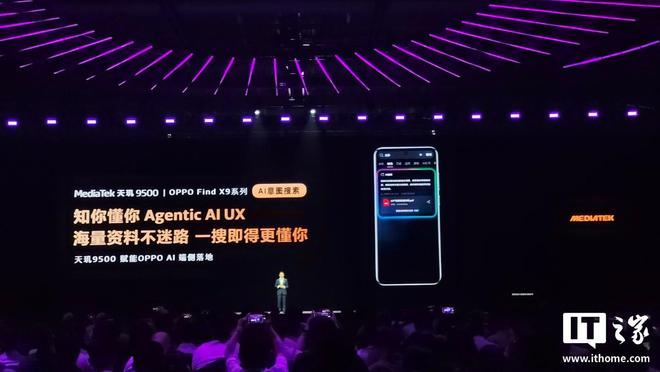 天玑 9500 赋能 vivo 蓝心 3B 大模型端侧运行,vivo X300 系列手机蓝心 AI 录音机支持主动及时 Agentic Al UX,即时文本转写,自动智能命名;天玑 9500 还赋能 OPPO AI 端侧落地,Find X9 系列手机 AI 意图搜索拥有知你懂你 Agentic Al UX,号称“海量资料不迷路,一搜即得更懂你”。