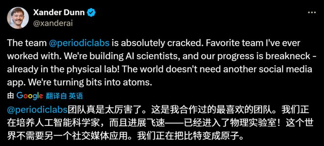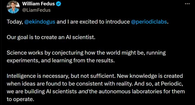 今天,@ekindogus和我很高兴介绍@periodiclabs。 我们的目标是培养一名人工智能科学家。 科学的运作方式是推测世界可能是什么样子、进行实验并从结果中学习。 智能是必要的,但并非充分条件。当发现想法与现实相符时,新知识便会诞生。因此,在Periodic,我们正在培养人工智能科学家,并为他们打造自主运作的实验室。 迄今为止,科学界的人工智能进步都源于在互联网上训练的模型。然而,尽管互联网规模庞大,其规模依然有限(据估计,互联网上大约有10T个文本标记,而一个英文单词可能由1-2个标记组成)。近年来,最前沿的人工智能模型已经完全耗尽了互联网的容量。 研究人员寻求更好地利用这些数据,但正如任何科学家都知道的那样:虽然重读教科书可能会带来新的见解,但他们最终需要尝试他们的想法,看看它是否成立。 自主实验室是我们战略的核心。它们提供海量高质量数据(每个实验都能产生数GB的数据!),这些数据在其他地方是独一无二的。它们也产生了宝贵的负面结果,但这些结果很少被发表。但最重要的是,它们为我们的AI科学家提供了行动的工具。 我们从物理科学开始。 技术进步受到我们设计物理世界的能力的限制。 我们之所以从这里入手,是因为实验具有较高的信噪比,并且(相对)速度很快,物理模拟可以有效地模拟许多系统,但更广泛地说,物理学是一个可验证的环境。人工智能在拥有数据和可验证结果的领域(例如数学和代码)进步最快。在这里,自然就是强化学习的环境。 我们的目标之一是发现比现有材料工作温度更高的超导体。重大进展将有助于我们打造下一代交通工具,并构建损耗最小的电网。但这仅仅是一个例子——如果我们能够实现材料设计的自动化,我们就有可能加速摩尔定律、太空旅行和核聚变的发展。 我们还致力于将我们的解决方案应用于工业界。例如,我们正在帮助一家半导体制造商解决芯片散热问题。我们正在为他们的工程师和研究人员培训定制代理,帮助他们理解实验数据,从而更快地进行迭代。 我们的创始团队共同创建了ChatGPT、DeepMind的GNoME、OpenAI的Operator(现在是Agent)、神经注意力机制MatterGen;他们还扩展了自主物理实验室;并为过去十年中一些最重要的材料发现做出了贡献。我们齐心协力,致力于扩大规模并重塑科学研究的方式。 我们非常荣幸地获得了与我们拥有共同愿景的投资者的支持,包括领投我们3亿美元融资的(@a16z、@Felicis、DST Global、NVentures(NVIDIA的风险投资部门)、@Accel,以及包括@JeffBezos、@eladgil、@ericschmidt和@JeffDean在内的个人。他们的支持将帮助我们壮大团队、扩大实验室规模,并培养第一代AI科学家。 Periodic Labs志在重塑科研的底层流程:他们要让AI走进实验室、提出假设、执行实验、生成数据、优化设计——一步步逼近「自动化科学发现」的理想。