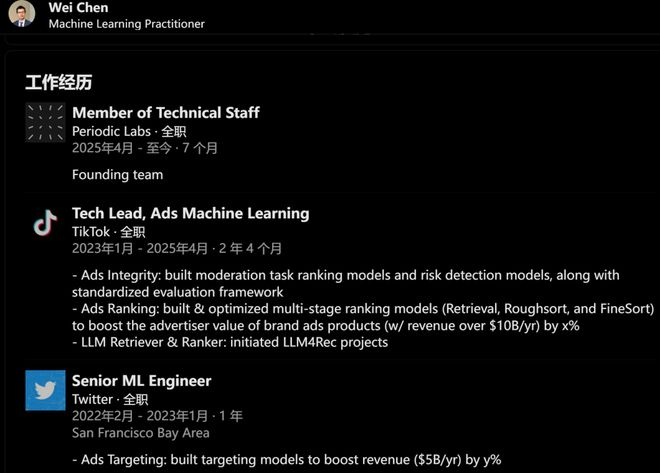 在加入Periodic Labs前,他在TikTok做技术领导,负责机器学习。