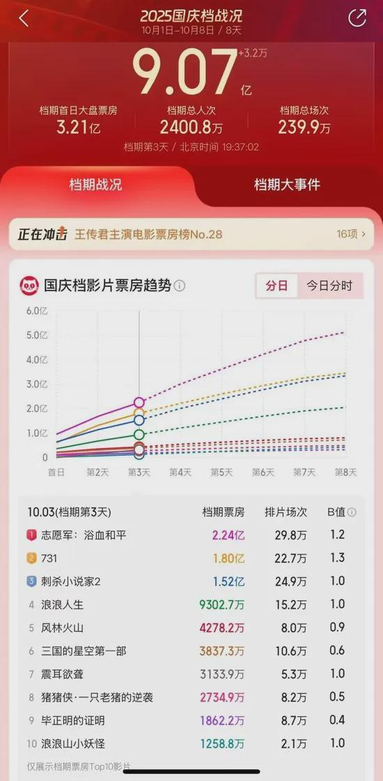 【2025国庆档票房破9亿】据灯塔专业版实时数据,截至10月3日19时10分,2025年国庆档(10月1日—10月8日)档期总票房(含预售)突破9亿。(界面新闻)