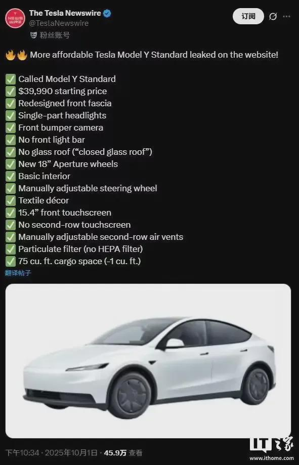 【特斯拉Model Y低价版现身官网代码,外观内饰减配细节曝光】特斯拉官网源代码中悄然出现全新“Model Y标准款”相关信息,暗示这款流传数月的低价车型即将推出。据悉,该车型内部代号为“E41”,将大幅精简配置,减少豪华功能并简化硬件,定位为特斯拉产品线中价格最低的SUV。与长续航版和高性能版相比,Model Y标准款在外观上有多处调整,包括搭载全新18英寸“Aperture”轮毂,更侧重于提升能效。内饰配置也将缩减,但载物空间依然出色,达到75立方英尺。此外,该车型取消贯穿灯带,车灯造型谍照已流出。代码显示,Model Y标准款定价为39,990美元,是目前特斯拉售价最低的SUV车型,主要面向对豪华附加配置需求较低的消费者。不过,这一价格仅比长续航后驱版低5,000美元,可能只是临时占位价格,最终定价或有所调整。(凤凰网)