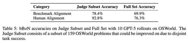 本文考察了评判器可能提升性能的任务(占 OSWorld 的 44%),结果发现评判器在 78.4% 的任务上做出了正确选择。进一步复核后发现:评判器实际上在 92.8% 的任务上是正确的,这意味着 OSWorld 的真实性能更接近 76.3%。