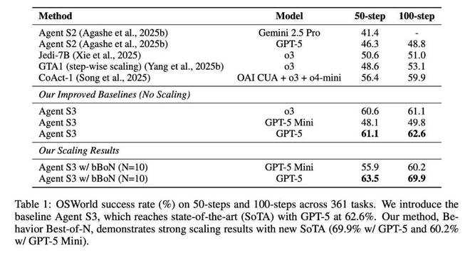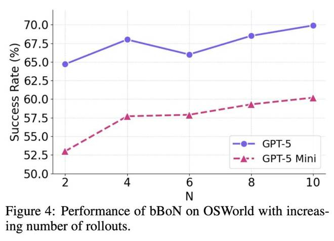 在改进基线的基础上,本文的核心贡献 Behavior Best-of-N (bBoN),在 GPT-5 上实现了 69.9% 的成功率(SR),相比 Agent S3 的单次运行提升了 7.3 个百分点;在 GPT-5 Mini 上实现了 60.2% 的成功率,提升幅度为 10.4 个百分点