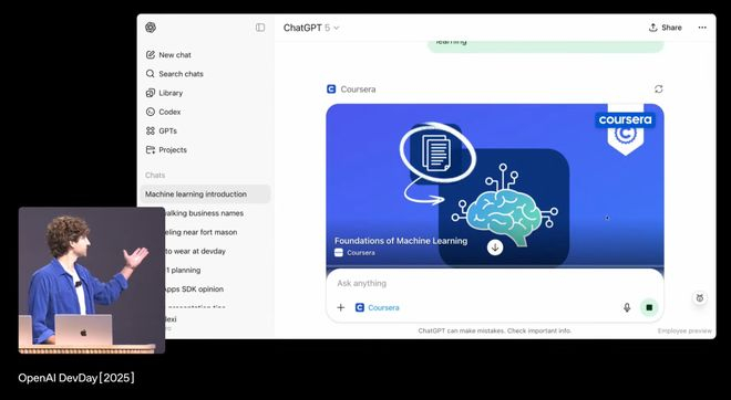 本届 DevDay 上,OpenAI 正式推出 "Apps in ChatGPT" 框架——开发者可以通过 SDK 将自己的服务嵌入到 ChatGPT 中,用户无需离开聊天界面即可触发、交互、购买。