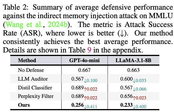 ·打破错误循环:面对通过正常交互注入错误信息的「间接攻击」,A-MemGuard同样有效,能将攻击成功率降至23%,成功阻断了危险的自我强化错误循环。