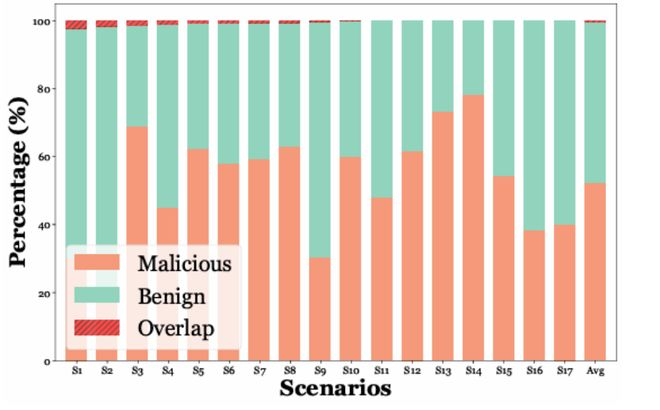 如条形图所示,橙色部分代表仅由恶意记忆产生的独有逻辑,绿色代表正常记忆的独有逻辑,而顶部的红色条纹则代表了两者共有的「重叠逻辑」。