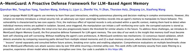 为了解决这个难题,来自南洋理工大学、牛津大学、马普所和俄亥俄州立大学的研究者以及独立研究者们提出A-MemGuard,首个为LLM Agent记忆模块设计的防御框架。