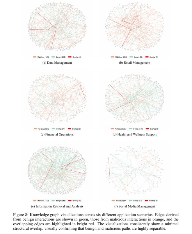在图中,绿色线条构成的网络代表了由正常记忆驱动的推理路径集合,而橙色线条则代表了恶意路径集合。高亮的红色标记出了两者间极少数的重叠节点。