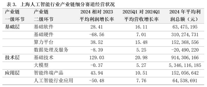 然而,当前AI应用企业经营状况逊于技术层和基础层企业(参考表2)。2024年上海人工智能技术层公司平均利润增长率为113.80%,而基础层公司下降6.18%,应用层公司下降42.09%。2025年第一季度上海人工智能技术层公司平均营收增长率相比去年同期增加19.13%,高于基础层的9.81%和应用层的8.00%。