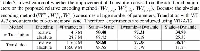 表5:具有更少参数的「相对Translution」取得了更高的准确率,证明了Translution带来的性能提升正是由所提出的相对建模引起的。