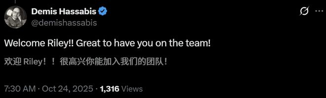 对于这次的加盟,就连DeepMind CEO Demis Hassabis,都亲自下场发帖欢迎了。
