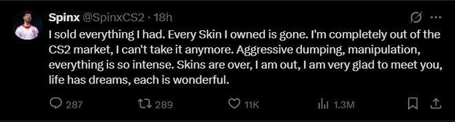 据科创板日报报道,面对崩盘,甚至有《CS2》职业选手选择恐慌性出逃。昨日MOUZ战队选手Spinx发文称:“我卖掉了所有东西,我退出CS2市场。疯狂的抛售与操纵,一切都太夸张了。”