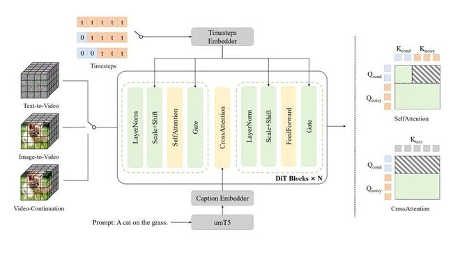 具体来说,整个模型以Diffusion Transformer(DiT)为框架设计,其中每个Transformer块都由3D自注意力层、交叉注意力层,以及采用SwiGLU激活函数的前馈网络组成。