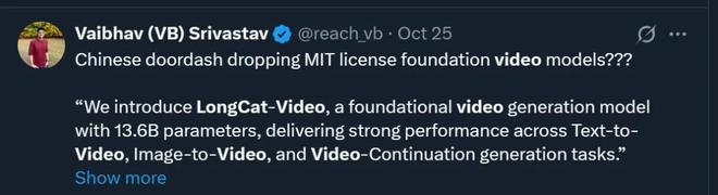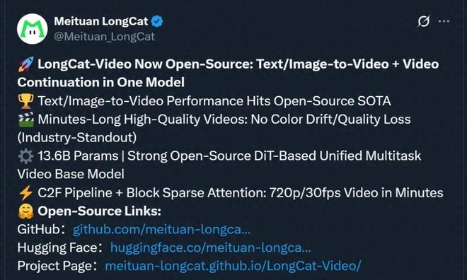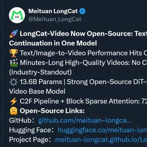 模型名为LongCat-Video,参数13.6B,支持文生/图生视频,视频时长可达数分钟。